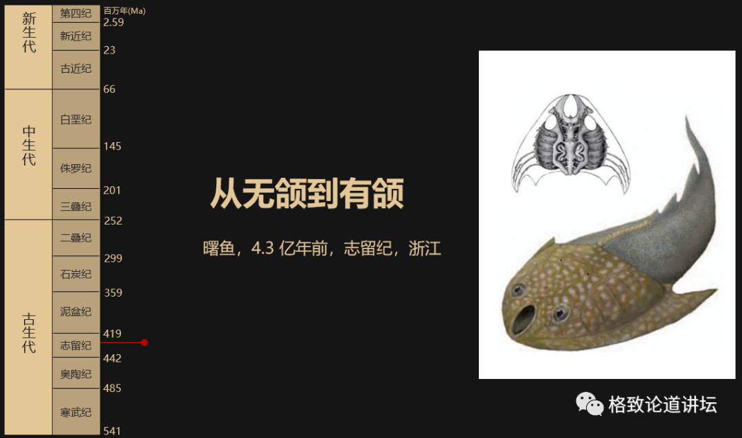 什么叫曙鱼呢?它实际上是一个无颌动物,我们看到这个动物有两个大眼睛,上面一个大的圆孔,那个不是它的嘴,是它的鼻孔,它的嘴还在下面呢。