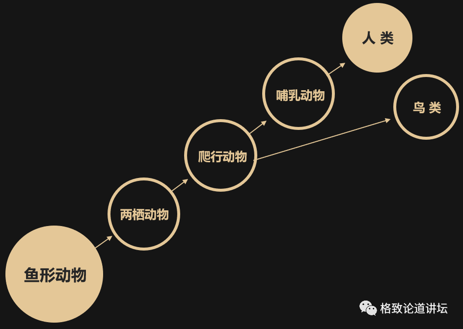 从两栖动物到爬行动物,爬行动物开始分支,出现了哺乳动物,也出现了鸟类。
