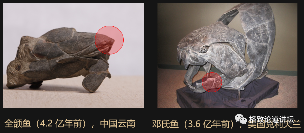 这是两个非常典型的代表,比如全颌鱼生活在4.2亿年前,它嘴的结构和现在生物的嘴的结构也很像嘛,是吧?