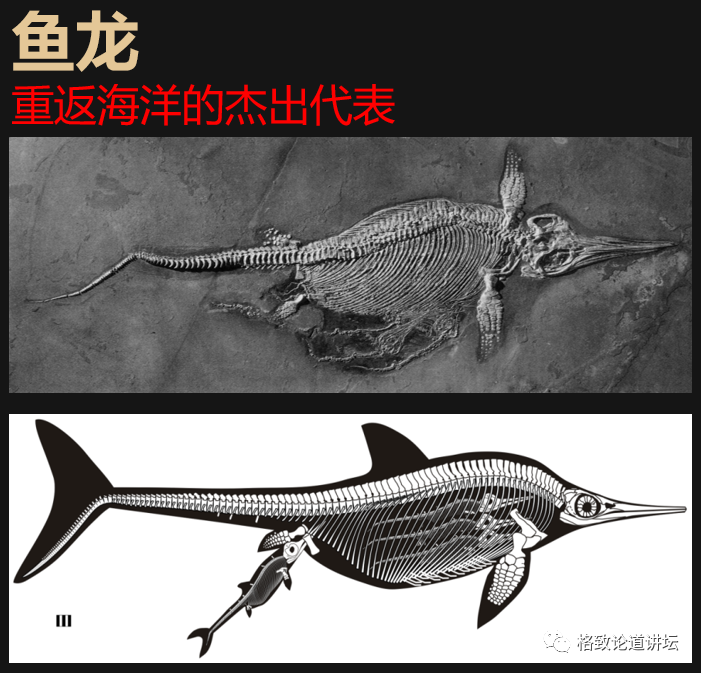 其中最典型的就是鱼龙,它为了适应于海洋生活,它的胳膊、腿已经变成了鳍状肢,像鱼鳍一样的。
