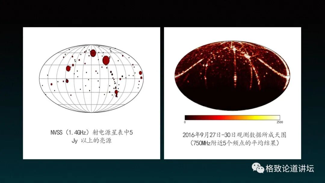大家可以看到,右边就是我们用初光观测产生的天图,左边对应的是其它望远镜之前测到的天图。我们现在只是一次初步的测试,所以这还是一个不太灵敏的结果。