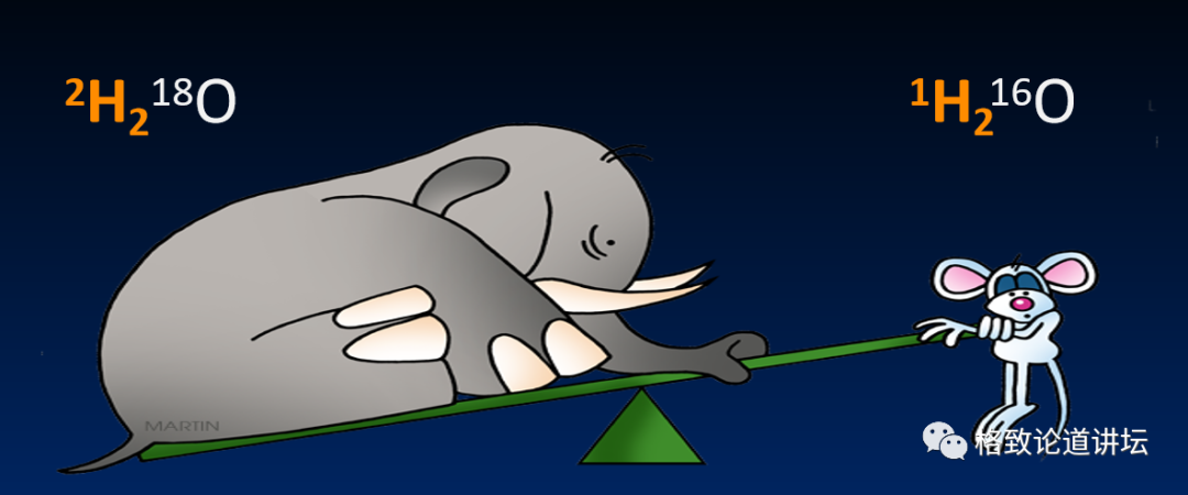 在原子层面上可以组合成十几种不同的水,如果说重同位素比较多的水和轻同位素的水相比的话,质量差别是很大的。
