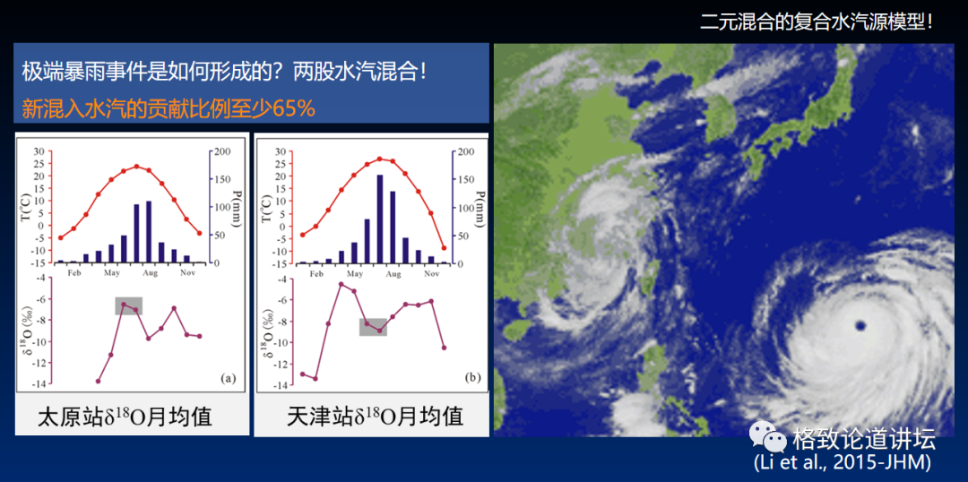 把降水的量的变化、温度的变化和同位素的变化进行对比,用理论模型做一下计算,我们发觉这个原因是由于两股水汽在这里混合了。