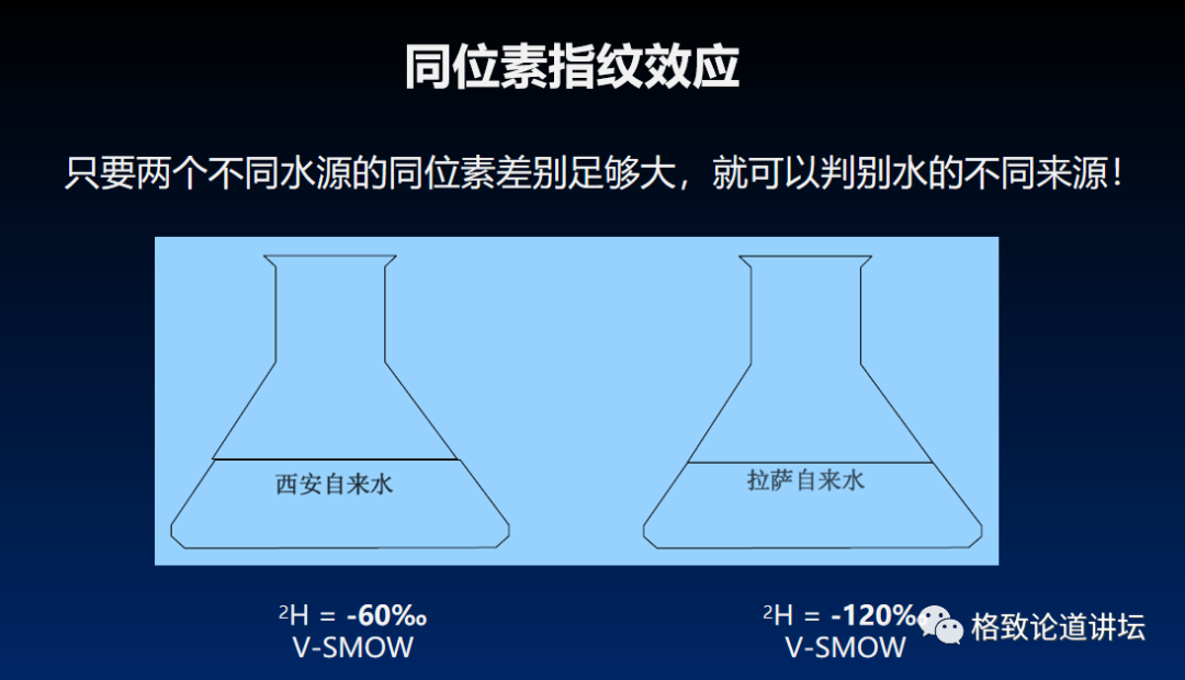 所以不同地方的水,我们知道它们的同位素成分,不过青藏高原是个例外,因为它的高程特别高。
