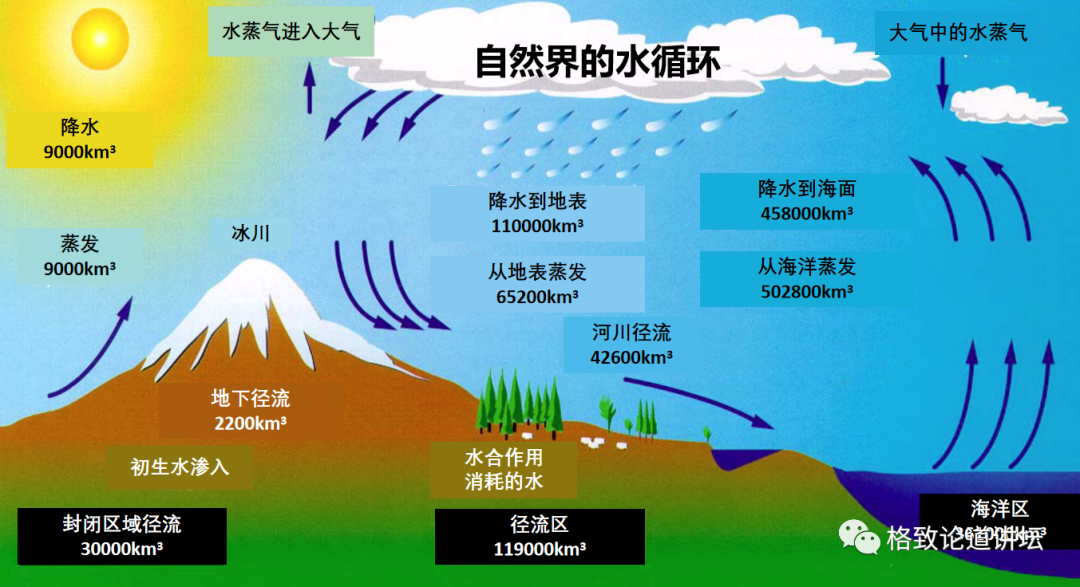 这里我们也看到了火山,火山喷发的时候会从地球深部带出地球内部的水,这就是水循环的大的格局。