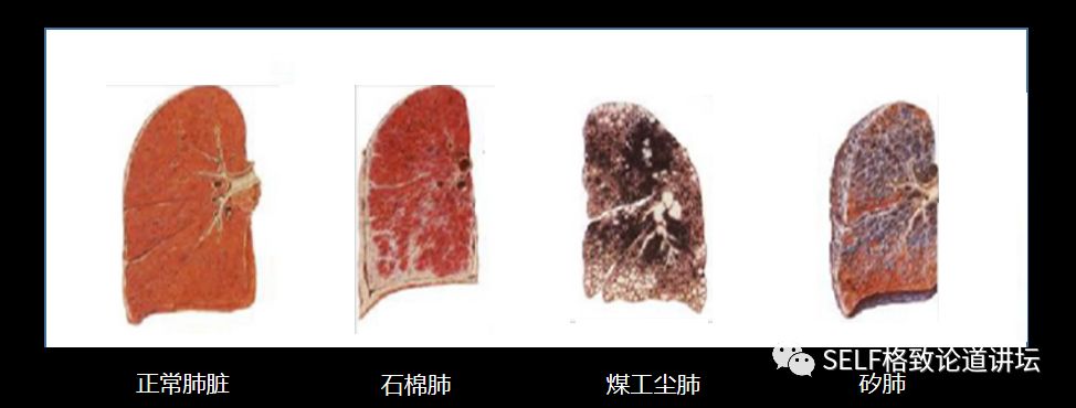 这是正常的肺照片和有尘肺病的照片,与标本里面所提到的一些,像石棉肺、煤工尘肺和矽肺都是比较常见的尘肺病的分类,这里面不同的颜色都是病灶所在。