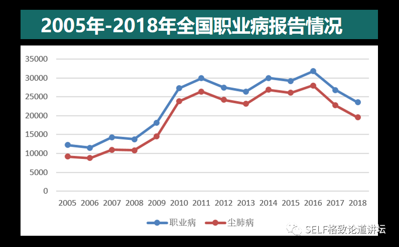 我所提到的职业病是由于人们在劳动过程中受到了某种因素的危害,确确实实发生在身上的病痛,是确确实实能影响我们身体健康的。这张图是2005~2018年我国所公布的每年报告的职业病病人数量的变化曲线。