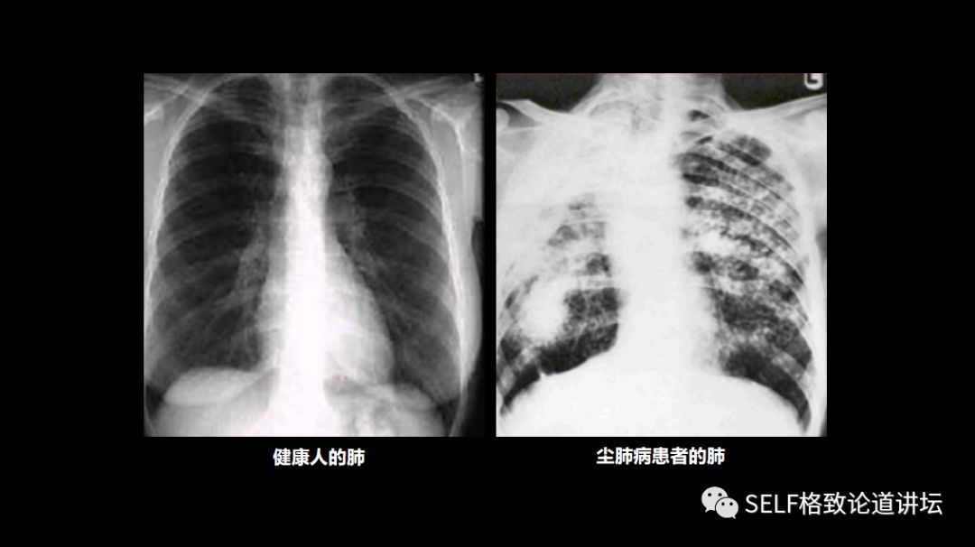 在X光片下,可以看得更加明显,左边是正常的肺脏照片,肺组织里面干干净净的,什么都没有。如果是一个尘肺病患者的照片,在X光片上就可以看到不同的小阴影、大阴影,实际上这些都是粉尘在肺组织里逐渐凝聚、增多而造成的。