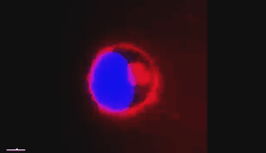 蓝色的是细胞核,外边一圈粉色的是细胞膜外包裹的药物。这个药物进入到细胞里,然后把细胞杀死了。