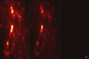 比如左边这幅图,每次每个图都在闪烁,每次只看一个点,同时把它的位置记录下来。通过很多幅这样图像的叠加之后,我就可以看到最右边具备超分辨水平的图了。