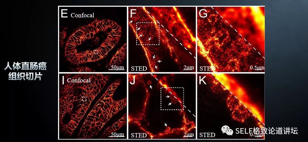 这是人体直肠癌组织切片的照片。左边是共聚焦的图,它最多只有200~300纳米;右边是它的囊泡里面蛋白质分布的照片。它非常清楚。通过右边的这些照片,我们的科学家可以进一步阐述癌症的发病机理。