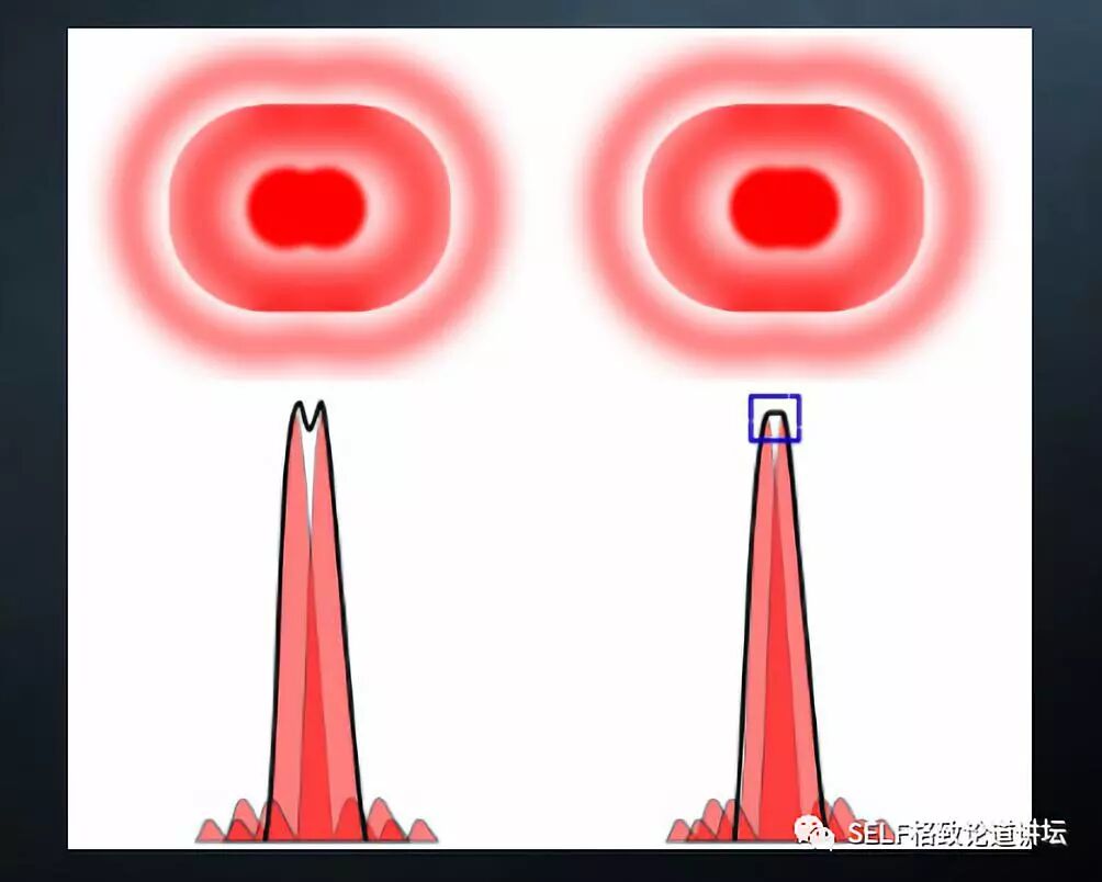 如果两个点离得足够近,我们依然能把它们分清。那么这个时候,我们就认为它达到了一个极限的水平,就像这幅图。如果两个点离得特别近,近到我们很难把它们分清楚,那么这时的极限距离是多少?