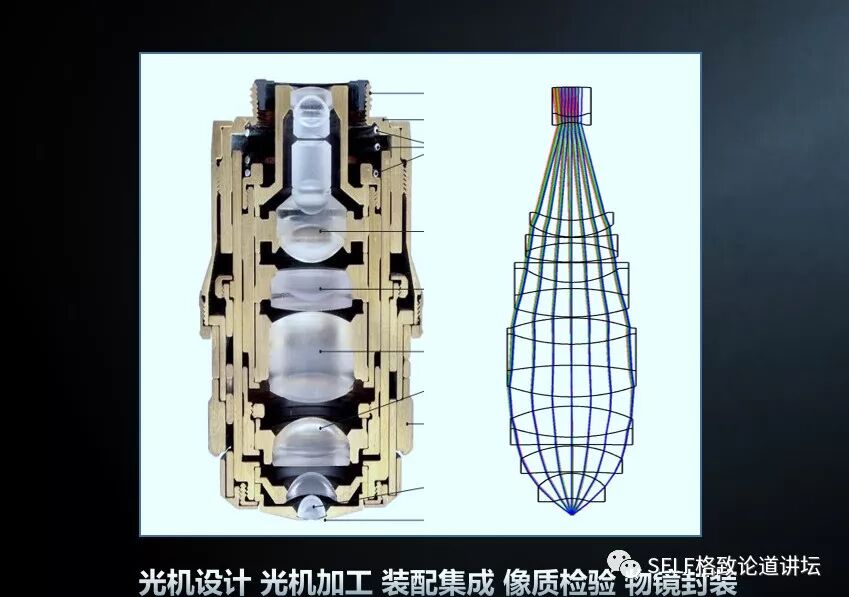 这张图就是它的一个剖视图。在40毫米长的范围内,有大约十几片到二十几片的小光学元件,其中有的小光学元件只有米粒般大小。