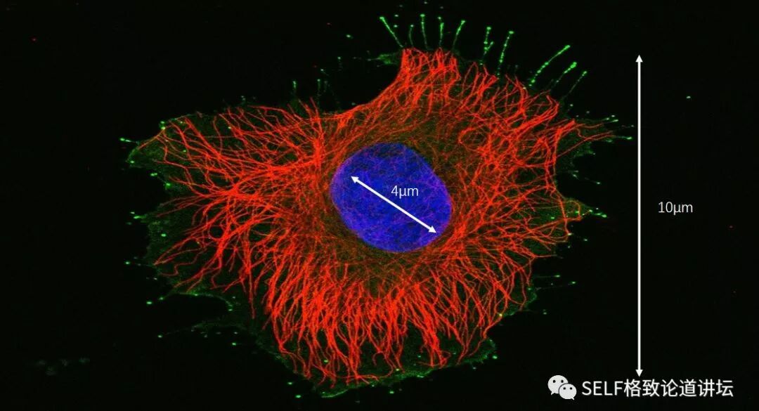 这是一张宫颈癌海拉细胞的图片。海拉细胞实际上是研究细胞的一个“小白鼠”。这个细胞的尺度约为10微米。我们研究癌症,不仅仅要看这个细胞的轮廓,还要看到它里面的这些红丝,这些小绿点,这些代表的是细胞中蛋白质等微细的结构。