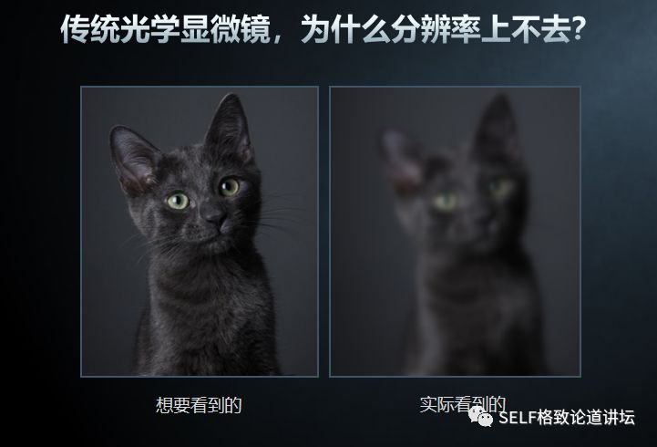 光学显微系统的成像原理:一个理想的物点经过光学显微系统之后,它会形成一个弥散的斑。就好像这只小猫,如果把它比喻成一个理想的物点,那么经过显微系统后,它就变得模糊了。