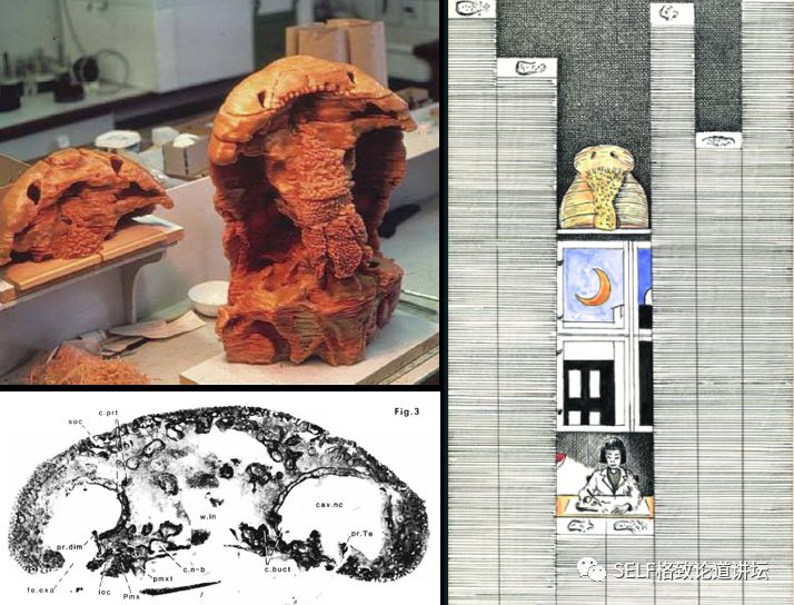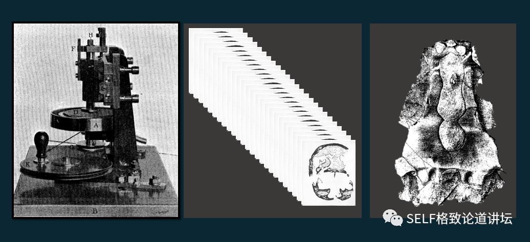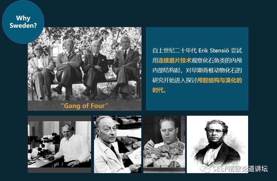 这张照片上是当时瑞典学派几个主要的创始人,他们是瑞典学派的4个巨头,他们主要做的研究工作是:利用连续磨片机把化石磨成很薄很薄的一片,然后对它拍照、绘图,最后再用蜡制模型的机器,重建出来一个完整的化石的脑颅,这样就可以用来进行研究了。