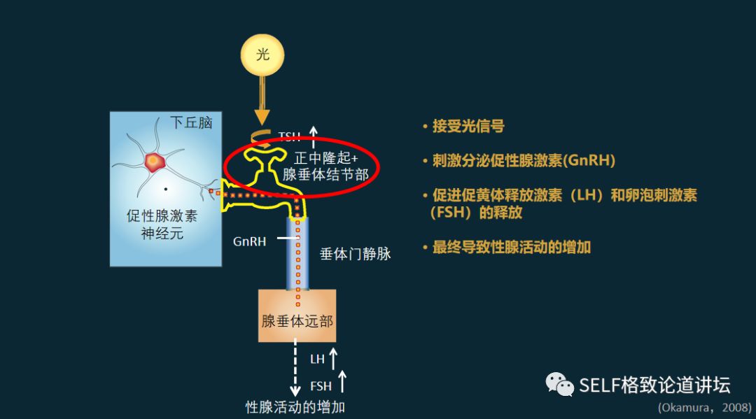 腺垂体结节部就是控制这个变化的中枢。都听过脑白金,脑白金里面起作用的是褪黑素,而腺垂体结节部里面最主要的就是褪黑素。它就好像是水龙头的开关一样,把它拧开,整个通路可以继续。