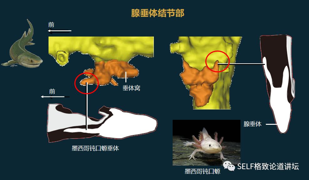 这对舌状突起,在所有的不管是现生鱼类还是化石鱼类中,我们都没有找到。当时我们一直很困惑,这到底是什么东西?但很有意思的是,我们在现生的四足动物——墨西哥钝口螈的垂体里面找到了相似的突起。