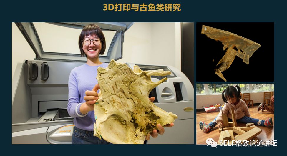 这个手上捧着一个大的3D打印标本的是我在澳大利亚国立大学的博士生,她拿着一个刚刚打印好的3D模型,大概有50多厘米;右下角是我女儿,她正在拼积木。