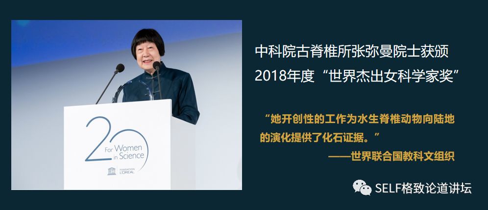 去年她获得了一个非常重要的奖——“世界杰出女科学家奖”,这是联合国教科文组织颁发的。因为“她开创性的工作为水生脊椎动物向陆地的演化提供了化石证据”。