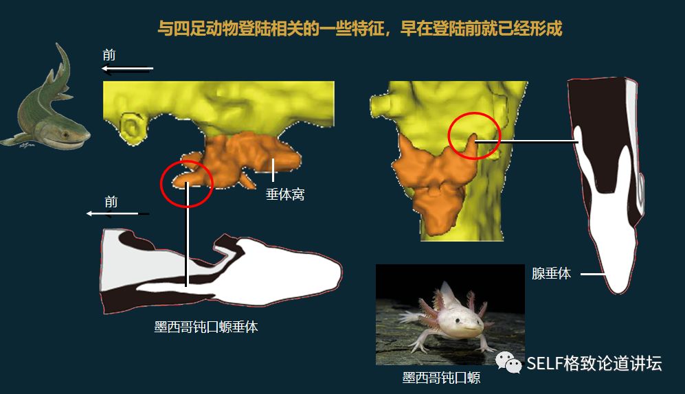 就好像前端的这一对突起,在它还是鱼类的时候可能没有用,但是当它爬上陆地后,所有的褪黑素都集聚在这个地方,执行了调节的功能,这就是演化中的预适应现象。