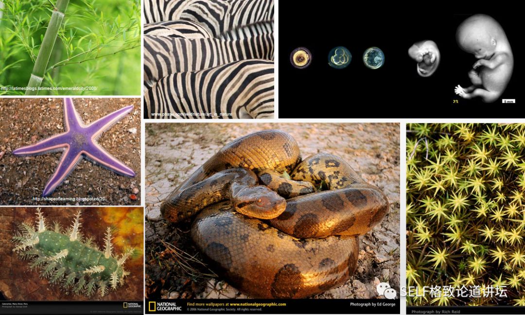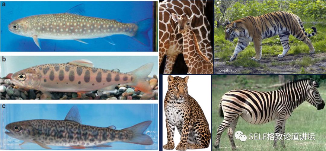 这些美丽的图案,有斑马的条纹、老虎的条纹,它们是怎样从一个细胞通过生长、发育,形成这样漂亮的图形的呢?如果人类自己去建造、去设计这样的图形,要怎么做呢?