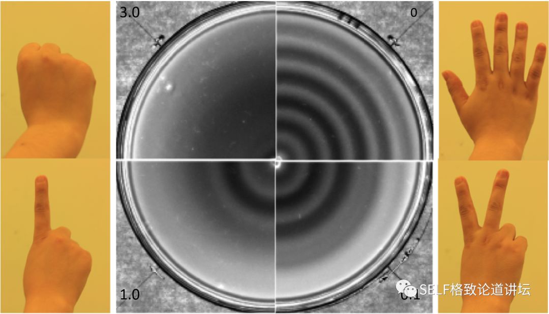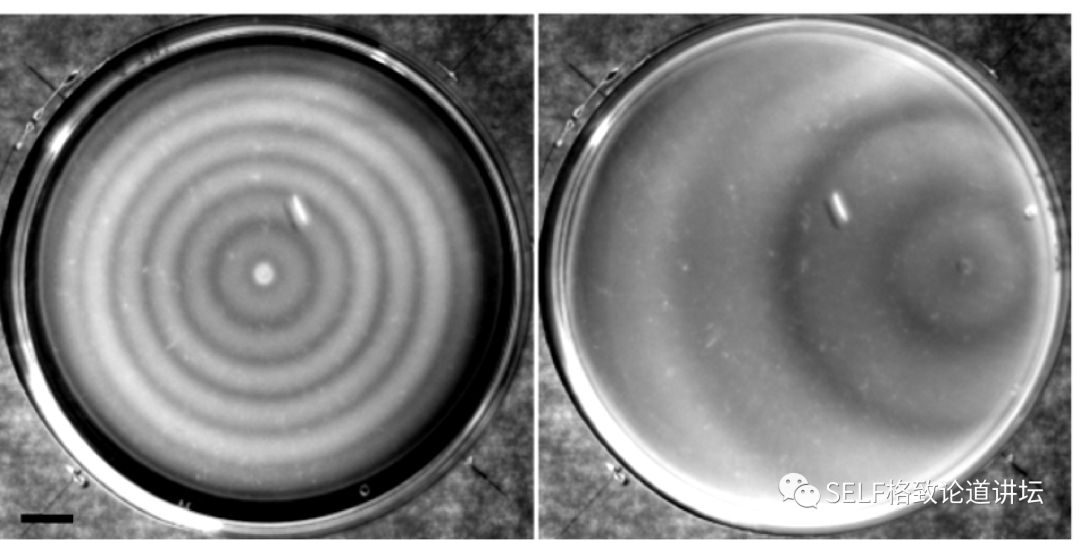 如果我们从其他的物种借一些基因,加入一些设计放到这个细菌中,我们再将这样的一个细菌放到培养皿里,它就能够自己生长、发育,变成这样一个条纹的状态。你不做任何人为的干扰,只要把它点在培养皿上,它自己就长出来了。