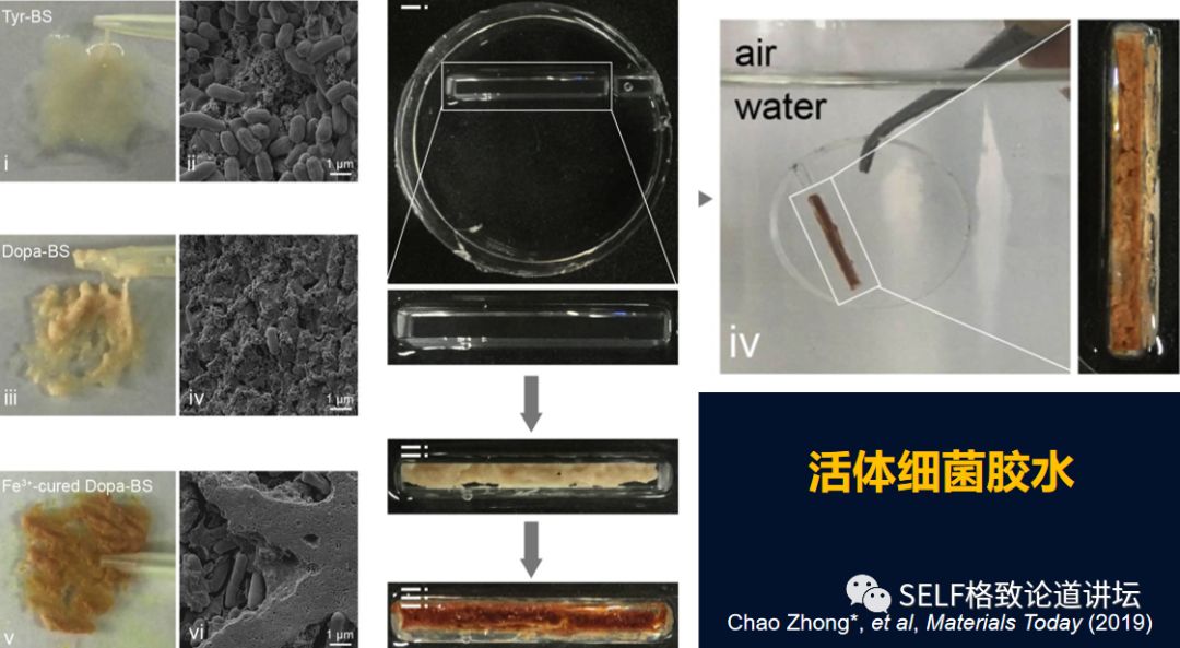 第二个例子,我的好朋友钟超教授在用细菌生产胶水,这个细菌能够不断繁殖,也就是说这种胶水永远用不完,自己会生长,你要用的时候加一点铁离子,它就凝固了,而且在水下面也可以用。