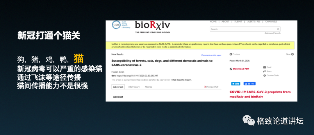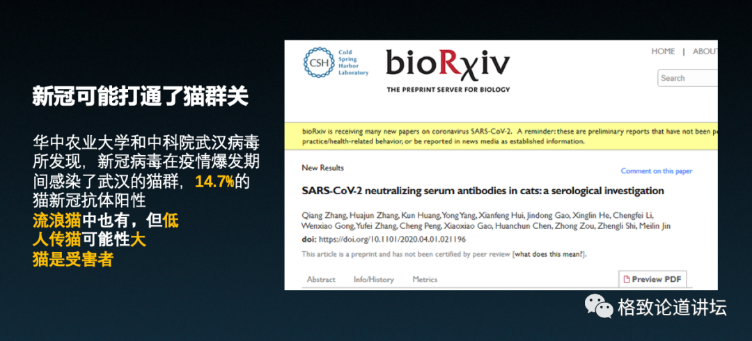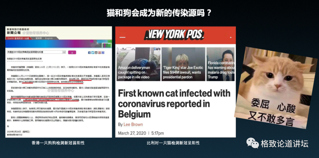 最近大家又开始关心宠物。之前有一个报道,说香港发现有一只狗咽拭子检测到新冠核酸呈弱阳性,这说明新冠病毒在狗那儿可以突破细胞关。后来又有新的报道,说比利时有只猫被新冠病毒感染了,这只猫也很痛苦。