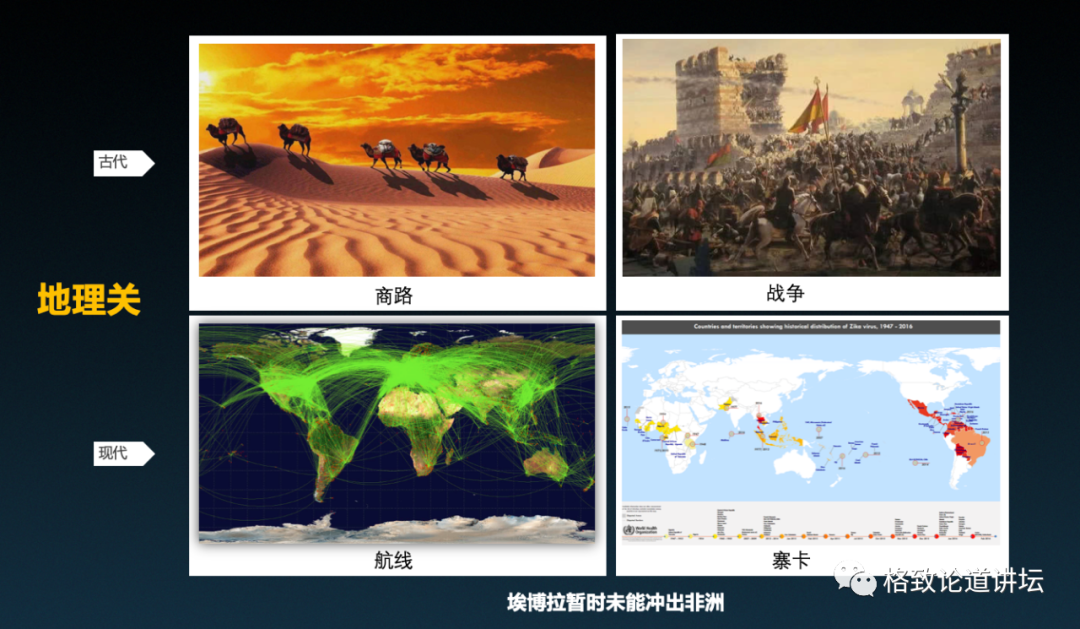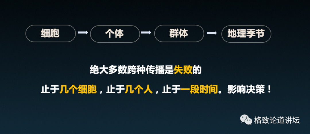 感染一个群体实际上是不够的。大多数传染病实际上是地方流行病,如果说不能传到一个大的地理范围就难成气候。所以病毒还要打通下一关,叫地理关。