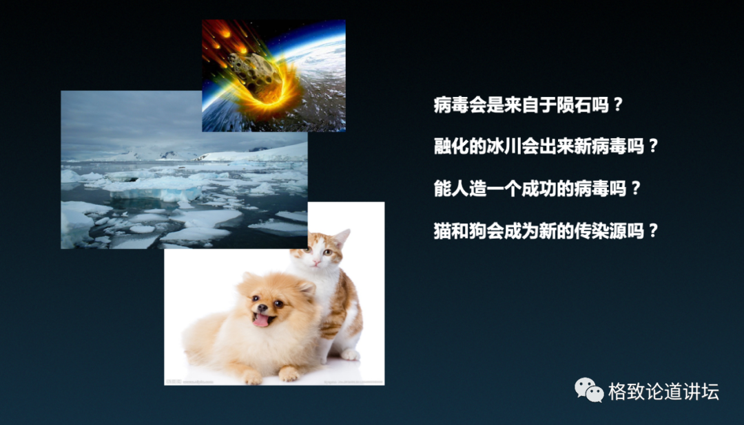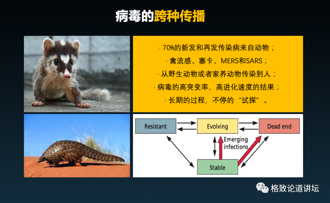 讲病毒的通关,实际上都是讲新出现的病毒,我们叫新发,或者再出现的传染病。禽流感、寨卡、摩尔斯、SARS、新冠这些病毒都是动物来源的。70%的新发和再发传染病是来自于动物的,要么是野生动物,要么是家养的家畜,或者是宠物。