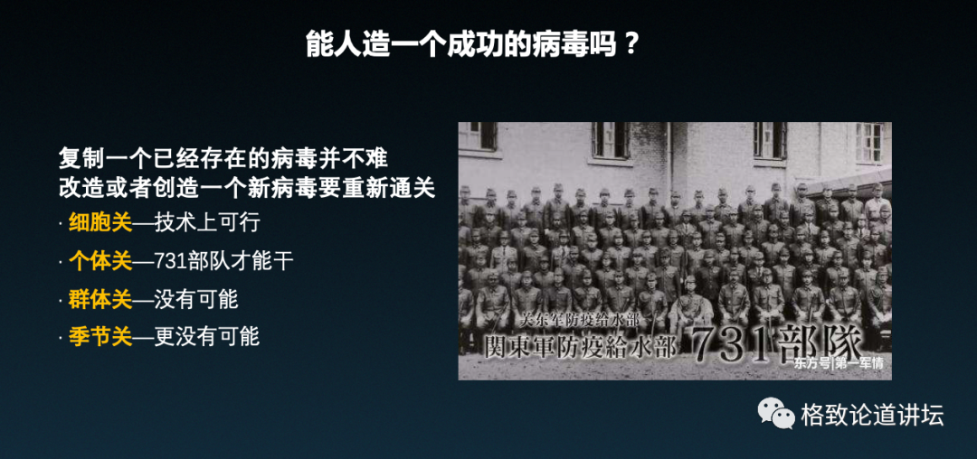 哪怕病毒真正感染人的能力已经很强了,还有一个群体关要过。要有很大的人群才能检测,这实际上没法操作。更不用说季节关了,季节关简直是超出想象。所以造一个成功的病毒,可能性是微乎其微的。