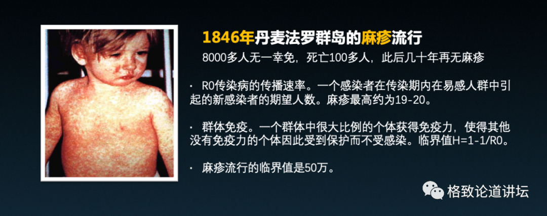 这个例子是1846年丹麦法罗群岛的麻疹流行。在此之前,法罗群岛是没有麻疹的,有一个工人坐着船把病毒带进了群岛,当时整个岛八千多人无一幸免,死亡一百多人。但是,感染之后,几十年内,群岛也再也没有出现麻疹病毒。