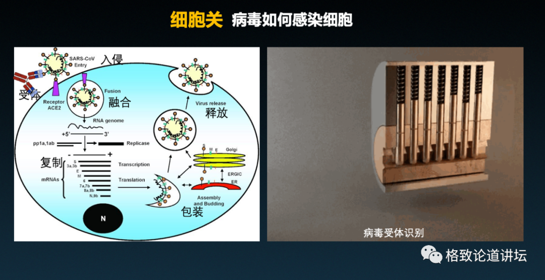 病毒进入细胞的第一步是跟细胞里的受体结合。SARS病毒的受体是ACE2,它首先要跟ACE2特异地结合,受体识别是非常特异的,如果识别不够牢靠,它是进不去的。