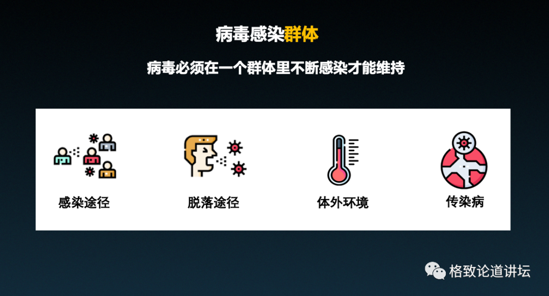 病毒只感染一个个体也是不长久的,因为个体会死亡,所以病毒必须在一个群体里持续地感染才能够维持下去。这就有点像原子弹里的链式反应,必须不停地感染,只要一停下来,它早晚都会消失。