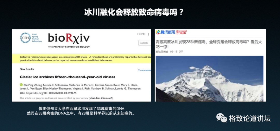 最近还有一个报道,说美国俄亥俄大学在青藏高原采集了很多冰芯,在冰川的冰芯里面他们发现有很多新的病毒。