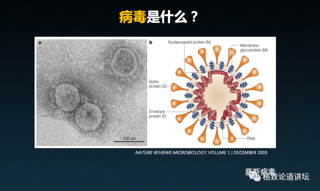 病毒长什么模样呢?我们可以看看这张图,这是另外一个冠状病毒——SARS病毒。这个病毒基本上是圆形的,外面的点点相当于新冠的“冠”,右边这个螺旋形就是它的核酸,外面一圈是磷脂,再外面突起的就是“冠”,叫S蛋白。