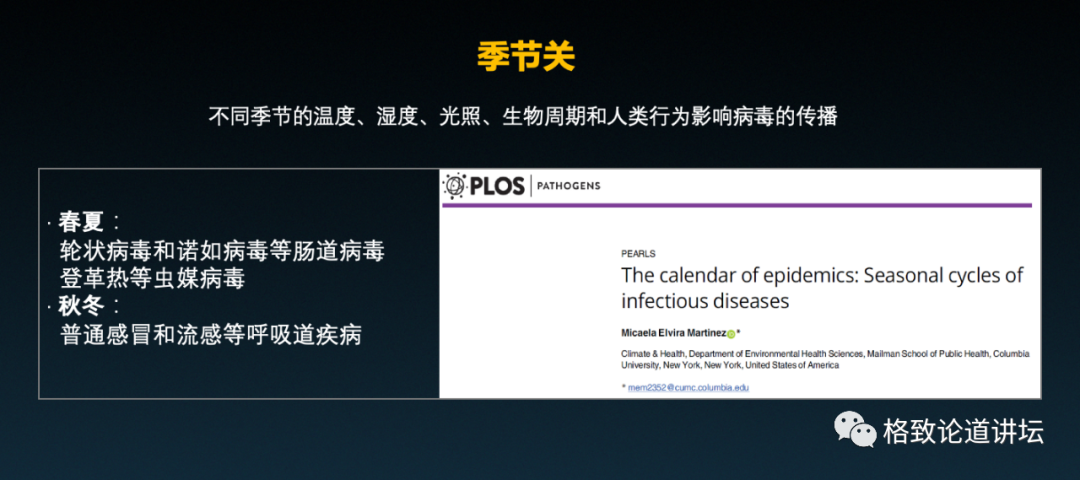 春夏之交的时候,该担心肠道传染病;再暖和一点,可能会有登革热感染;到秋冬季节,新冠又来了。所以季节对于病毒的传播还是非常重要的。