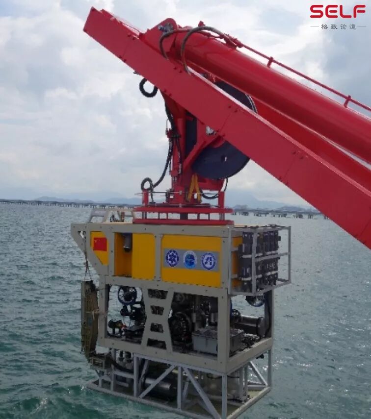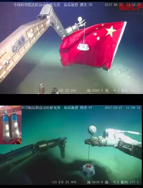 下图显示的是我们在2017年研制出的我国第一台6000米级的遥控水下机器人,当时,它在水深5600米的地方布放了一个标示物和一面国旗。那时我们觉得这个机器人是能够下潜到6000米级深度的唯一一个遥控水下机器人,所以我们在那个地方布置了一个标示物,表明我们曾经到达过这里。