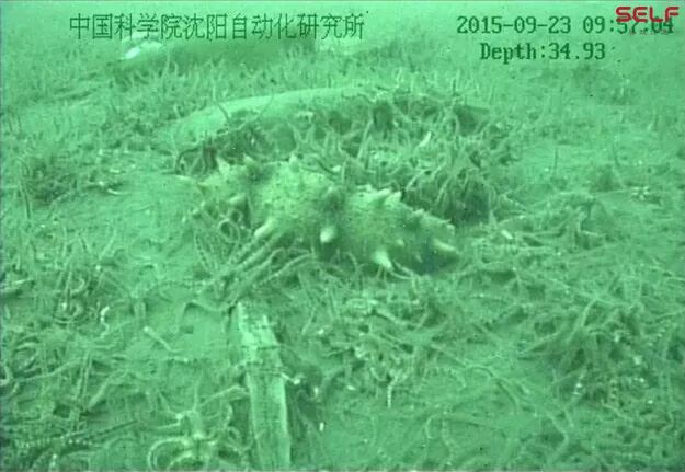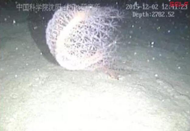 下图显示的是“海斗”号做浅海试验时在水深几十米地方拍摄到的海参,以及3000米海试时拍摄到的海底生物图片。