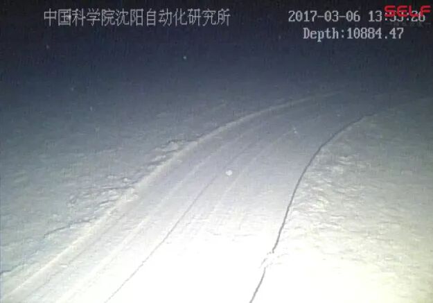 下图是2017年水下机器人在马里亚纳海沟底部安全着底时实时传输的海底视频截图。当时,母船上的很多科学家都是第一次看到深渊的景象,感觉像回到了远古时代,回到了那个以前从来没有人类去过的地方,看过通过光纤传输过来的深渊视频,大家都非常兴奋。图中的轨迹就是“海斗”号在海底进行坐底航行时留下来的,这个轨迹也永远地留在了马里亚那海沟的海底。