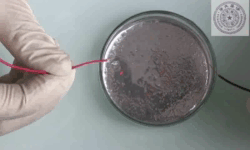 这次我们的同学找到了一个比较靠谱的东西,就是铜丝,当把这个铜丝插入到液态金属液滴之后,液滴很迅速地把铜丝给吃了进去,它可以自激振荡,同时我们还可以对振幅和频率进行调控。