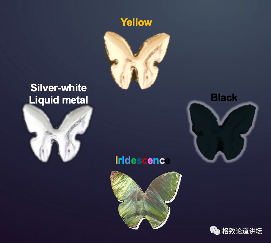 掌握了这样的基本原理之后,我们就对它的氧化层厚度进行了精密的调控。它可以变成黄色的液态金属、黑色的液态金属,甚至是五颜六色、彩虹色的液态金属。