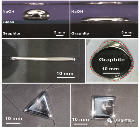 在这样的实验中实现了自由塑形的效应,通过调控它的机理,可以轻松得到液态金属线,三角形的液态金属,以及正方形的液态金属等等,当然更多复杂的形状也可以很轻松地得到。