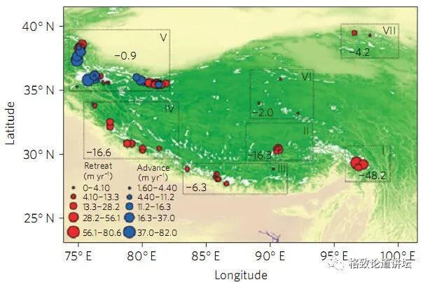 从图中可以发现,在整个青藏高原的东南部,或者说南部,它的退缩非常强烈;中部退缩的幅度减弱;而在西北部,冰川依然还在稳定状态,甚至部分冰川在往前移动。