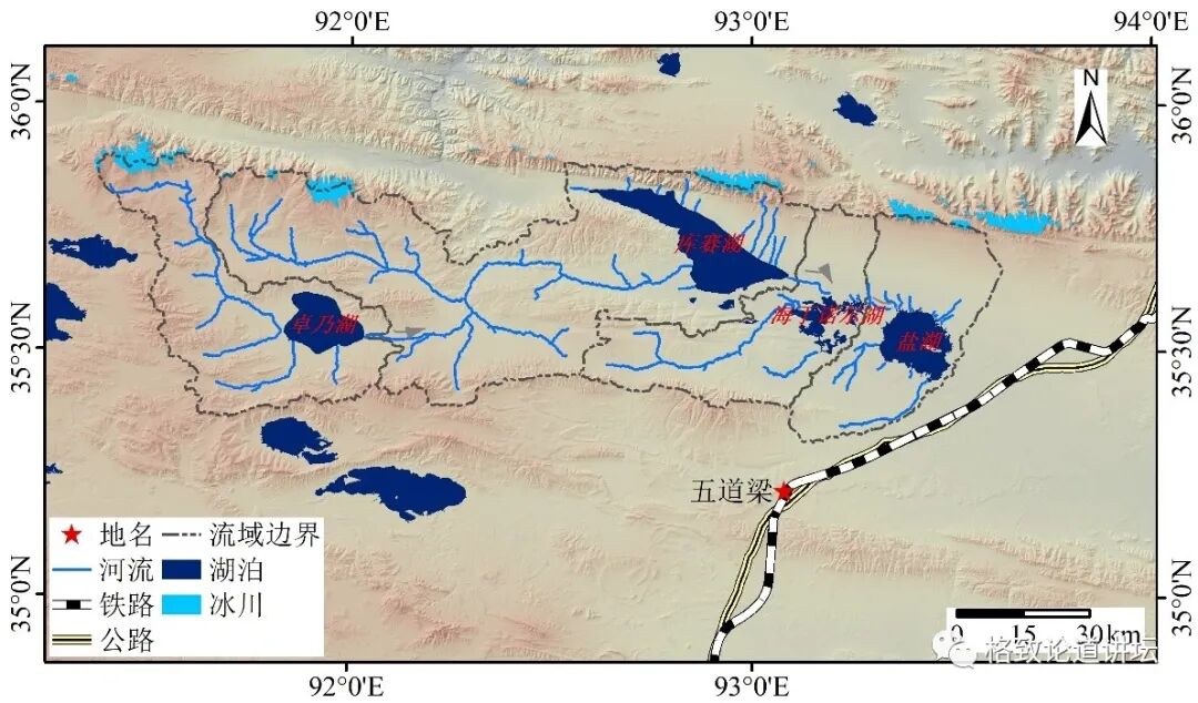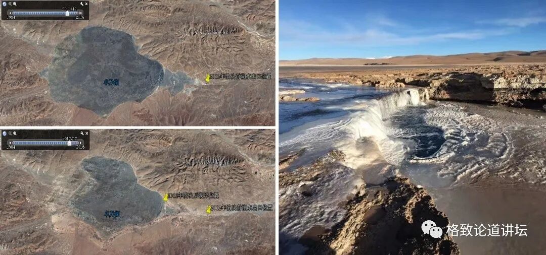 最终流出整整200多平方公里的水,三分之一的湖水都已经泄出。这些泄出的水沿着一段串珠性湖泊,先到了库赛湖,图中像鞋子形状的湖。而后途径中间的一个洼地,叫海丁诺尔湖。最终到达靠近青藏铁路公路的盐湖。
