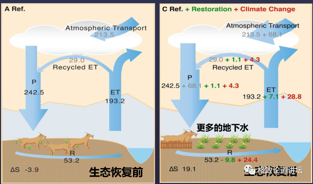 通过生态恢复以后,地下的径流减小,表明更多的水保留在土壤中。同时一部分进入大气的蒸腾的水分又通过循环回到区域内。