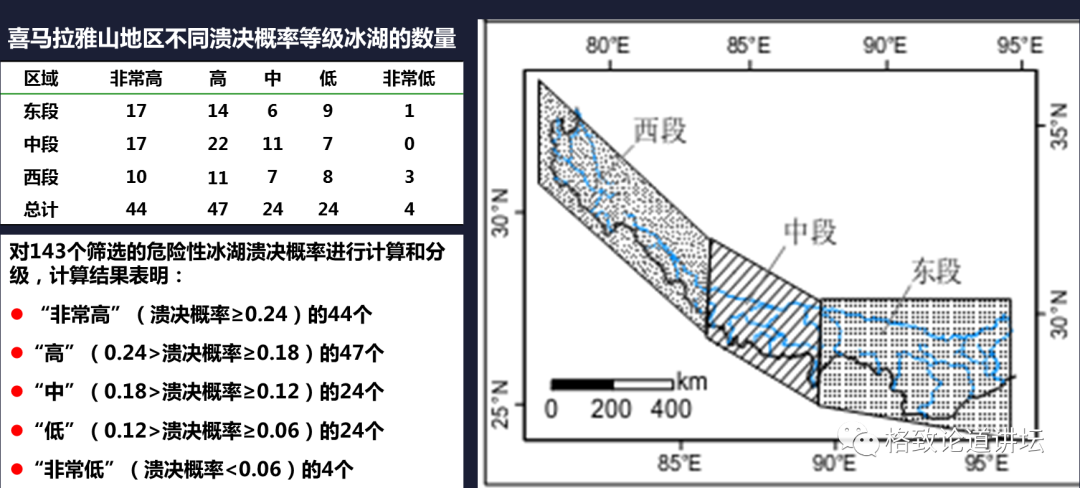 通过研究发现,在143个冰湖中,有“高”或“非常高”的溃决可能性的湖占到了65%,气候变化对冰湖溃决的影响起到推动的作用。