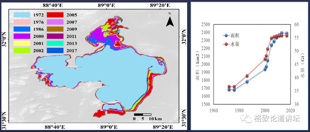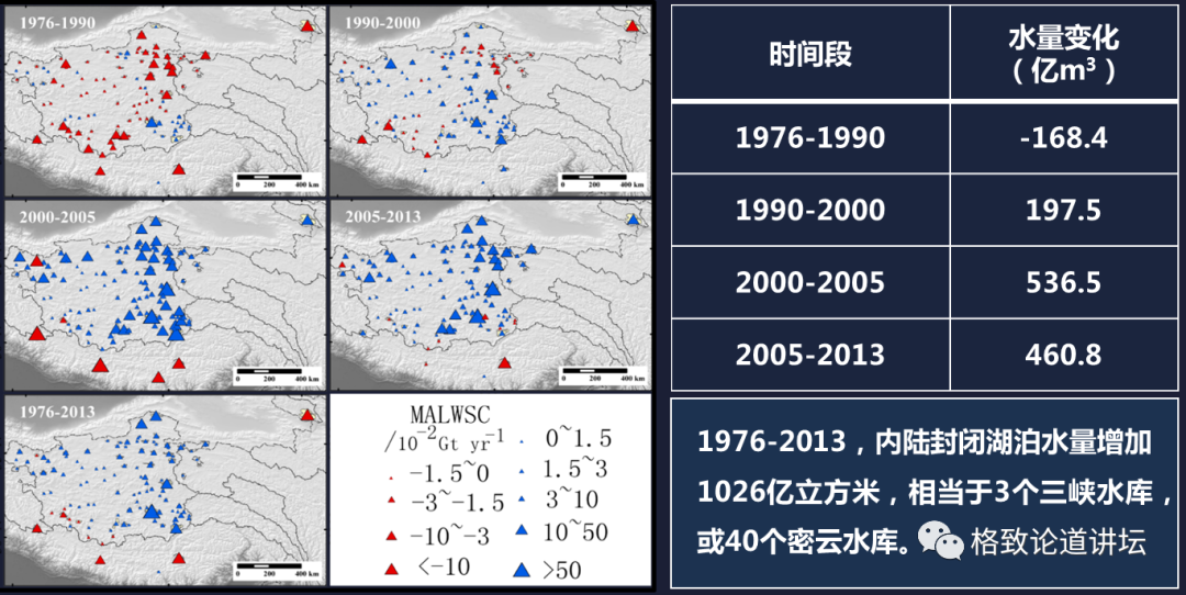 我们利用遥感卫星影像分析和八十几个湖泊的测量,还原了湖泊的繁衍,发现现在青藏高原的湖泊水量增加了1026亿立方米,相当于3个三峡水库或40个密云水库的水量。
