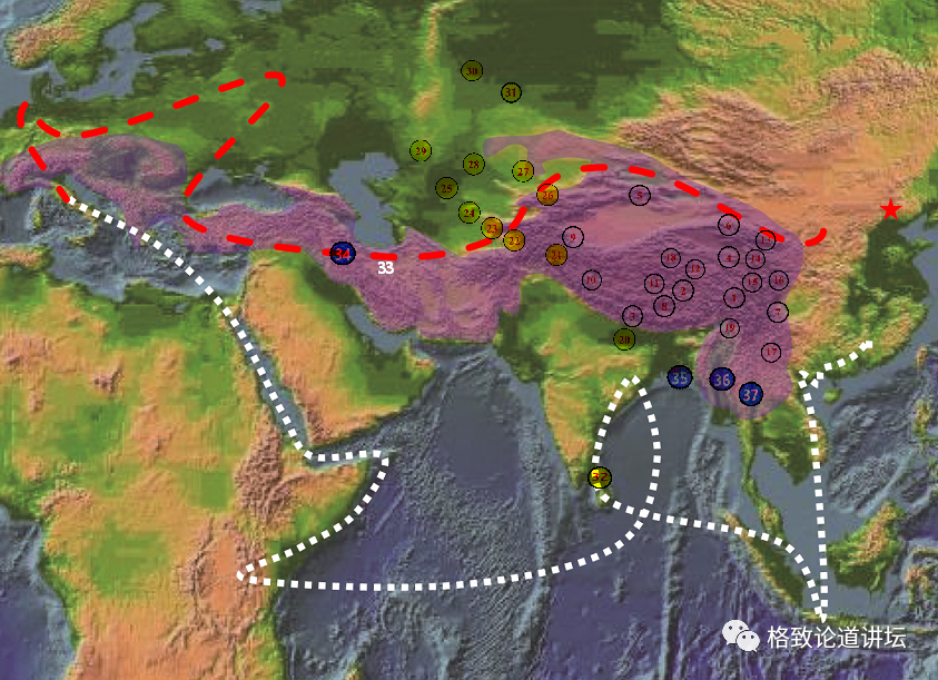 从这张地形图可以看出,欧亚大陆中部的这一片褐色土地面积最大,而且海拔又高,高的地势就体现出水塔汇聚供水的重要功能。